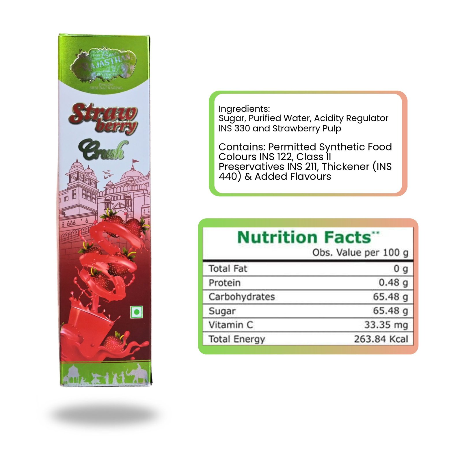 Ingredients – Sugar, Purified Water, Strawberry Pulp, Acidity Regulator INS 330, Contains Permitted Class II Preservatives INS 211, Thickener (INS 440) and Synthetic Food Colour INS 122 and Added Flavours.